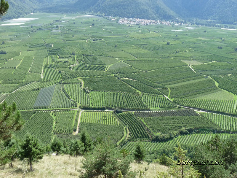 Auf dem Tarscher Murkegel drängen sich die Apfelfelder aneinander.